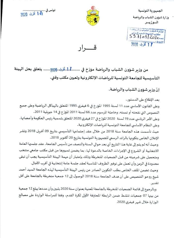 On 18 أبريل، 2020 by sarraاعلنت وزارة شؤون الشباب والرياضة، اليوم السبت 18 أفريل 2020، في بيان صادر عنها، عن حل الهيئة التأسيسية للجامعة التونسية للرياضات الالكترونية و تعيين مكتب وقتي لتسيير شؤونها الى حين انعقاد جلسة عامة انتخابية جديدة، حسب نص البلاغ التالي :