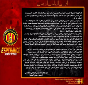 On 21 أكتوبر، 2020 by sarraأصدرت اليوم الاربعاء 21 أكتوبر 2020 هيئة الترجي الرياضي التونسي بيانا لتوضيح ما يتمّ تداوله في علاقة الفريق بكلّ من السيّد طارق بوشماوي و الجامعة التونسية لكرة القدم و جاء في البيان ما يلي :