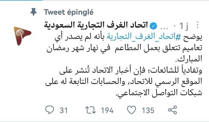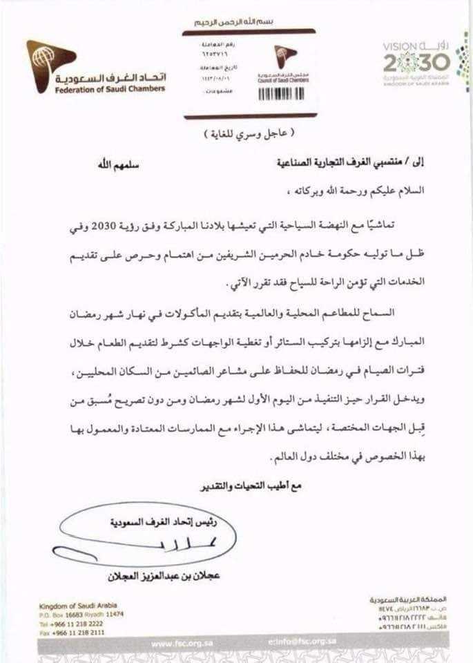 أعاد بيان مزعوم يوم 17 مارس 2022 هذا النقاش على مواقع التواصل. وثيقة منسوبة إلى “اتحاد الغرف التجارية السعودية” انتشرت على نطاق واسع. الوثيقة المعنية ، التي تحمل علامة “عاجل وسري للغاية” ، تسمح للمطاعم والمقاهي بخدمة العملاء خلال شهر رمضان موضحة هذه البادرة لإحياء السياحة في المملكة.