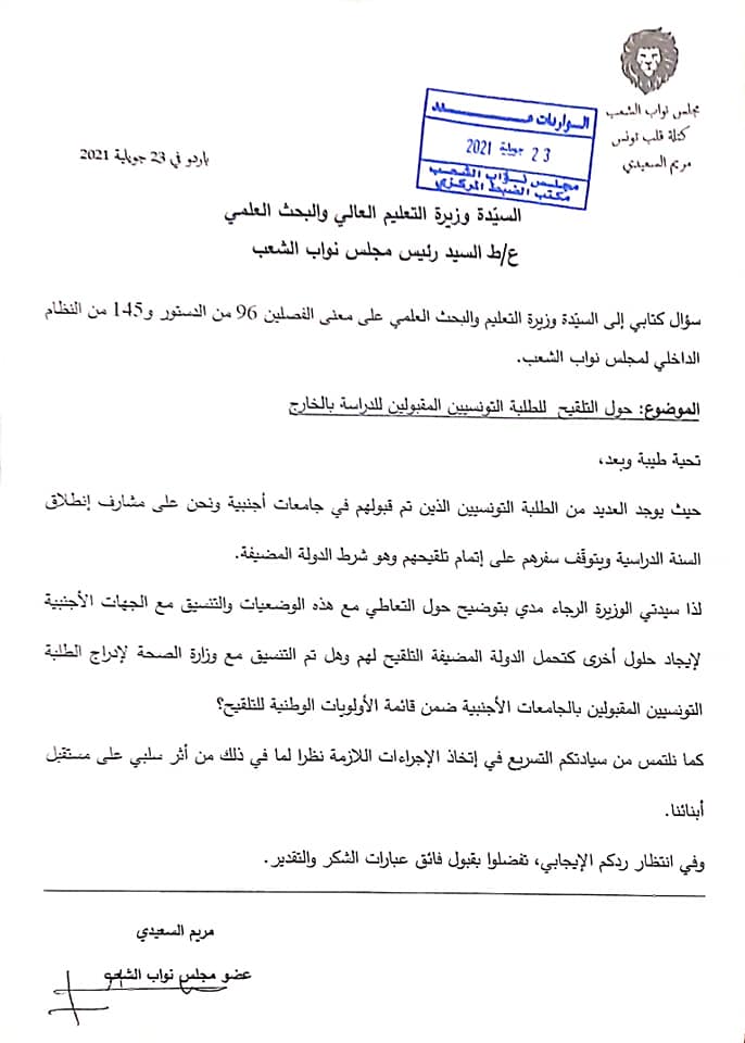 كوفيد 19: عملية تلقيح إستثنائية للطلبة المسجّلين الجدد بالجامعات الأجنبية. تلبية لطلب أحد نواب قلب تونس
