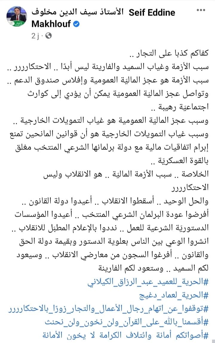 مخلوف: أسقطوا الانقلاب أعيدوا المؤسسات الدستوريّة وسيعود لكم السميد والفارينة