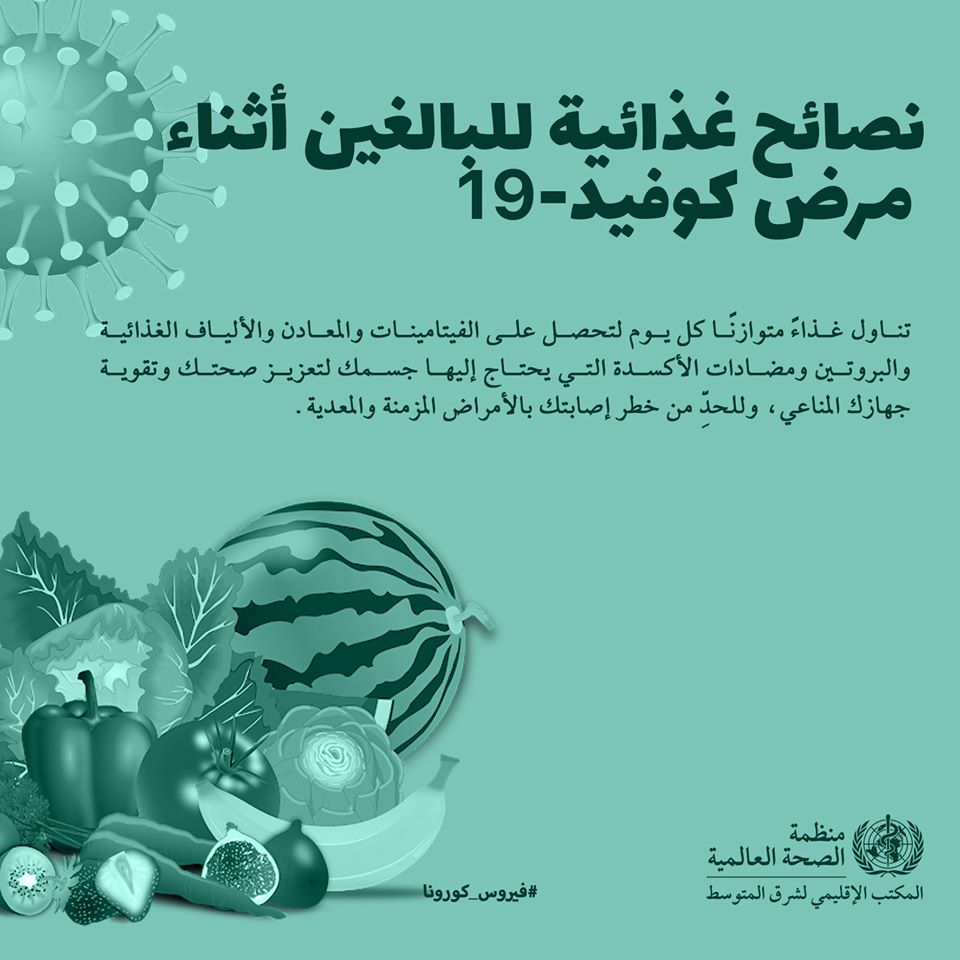 حيث تقدمت بنصائح للبالغين أنه |أثناء المرض وجب تناول غذاء متوازن كل يوم للحصول على القدر الكافي من: