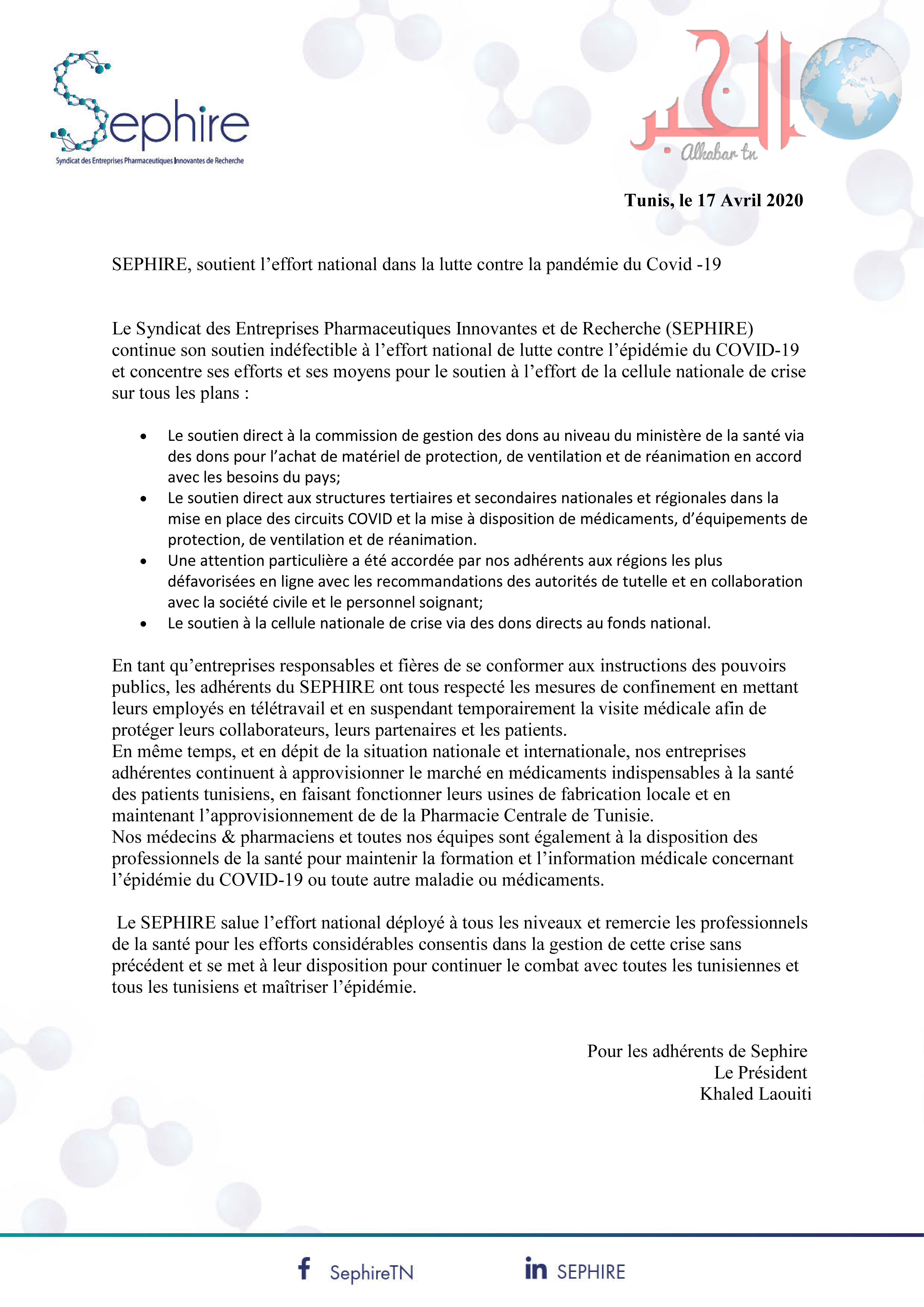On 20 أبريل، 2020 by sarraتواصل نقابة المؤسسات الصيدلية المجددة والأبحاث دعمها اللامتناهي للمد التضامني الوطني لمجابهة فيروس كورونا من خلال وضع جميع الإمكانيات على ذمة الصالح العام لمجابهة فيروس كورونا من خلال: