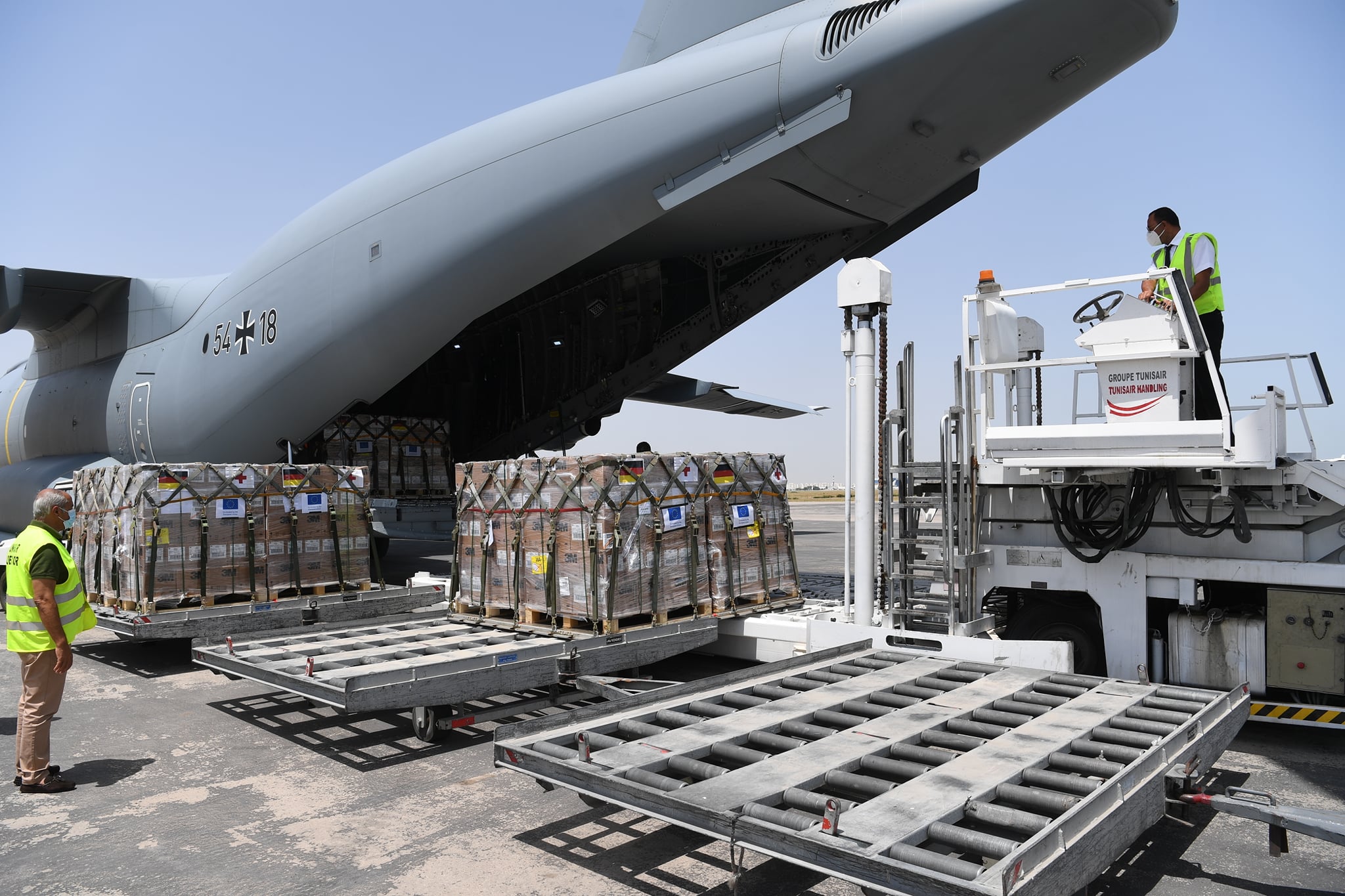 ورد على الصفحة الرسمية لرئاسة الجمهورية منذ قليل خبرا مفاده وصول طائرة عسكرية ألمانية لمطار تونس قرطاج محملة بأسرّة طبية ومعدات ومستلزمات صحية واختبارات تحليل سريع ضد فيروس كورونا ممنوحة من جمهورية ألمانيا الاتحادية لدعم جهود تونس في مواجهة جائحة كوفيد-19.
