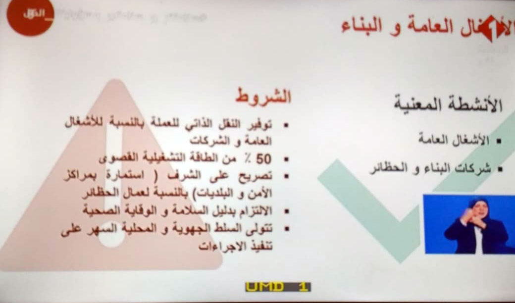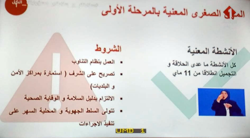 - الفئات الغير معنية بالحجر: الاشخاص الاكثر من 65 الحوامل و الحاملين للأمراض المزمنة و الأطفال أقل من 15 سنة عليهم الإلتزام بالحجر الصحي الشامل