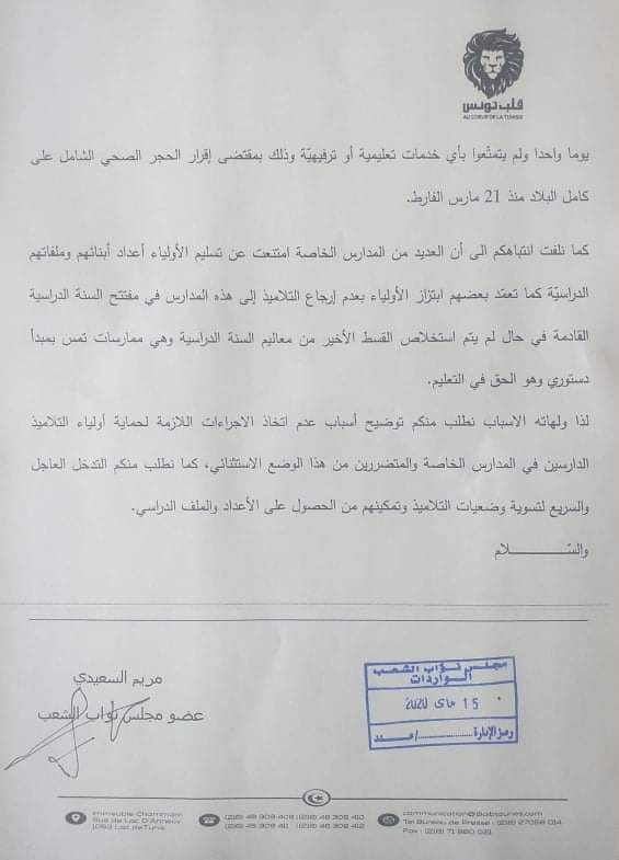 توجّهت النائب بمجلس نواب الشعب عن حزب قلب تونس مريم السعيدي، اليوم الجمعة 15 ماي 2020، بسؤال كتابي إلى وزير التربية محمد الحامدي حول استخلاص معاليم الدراسة للثلاثي الثالث في المدارس الخاصة والحصول على الأعداد والملف الدراسي للتلاميذ وذلك بناءا على الفصلين 96 من الدستور و145 من النظام الداخلي للبرمان.