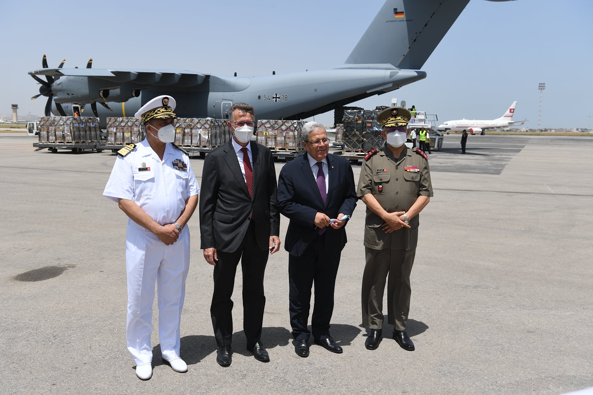 On 26 يوليو، 2021 by sarraورد على الصفحة الرسمية لرئاسة الجمهورية منذ قليل خبرا مفاده وصول طائرة عسكرية ألمانية لمطار تونس قرطاج محملة بأسرّة طبية ومعدات ومستلزمات صحية واختبارات تحليل سريع ضد فيروس كورونا ممنوحة من جمهورية ألمانيا الاتحادية لدعم جهود تونس في مواجهة جائحة كوفيد-19. وقد تم تسلّم هذه المعدات بحضور السيّد عثمان الجرندي، وزير الشؤون الخارجية والهجرة والتونسيين