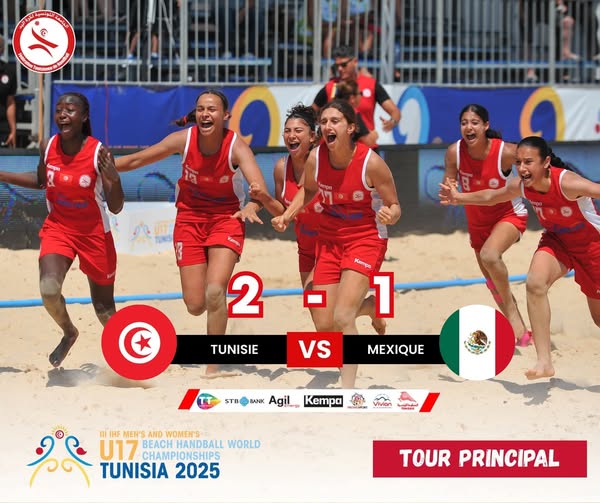 On 23 يونيو، 2025 by sarraحقق منتخبنا الوطني التونسي لكرة اليد الشاطئية (فئة تحت 17 سنة) انتصارًا مهمًا أمام نظيره المكسيكي 🇲🇽 بنتيجة 2-1، ضمن لقاءات تحديد المراكز من 9 إلى 16 في بطولة العالم المقامة بمدينة الحمامات أداء مميز لبنات تونس، اللواتي أثبتن عزيمتهن على أرض الوطن، مع تمنياتنا لهن بمزيد من التألق في باقي المواجهات Share me !